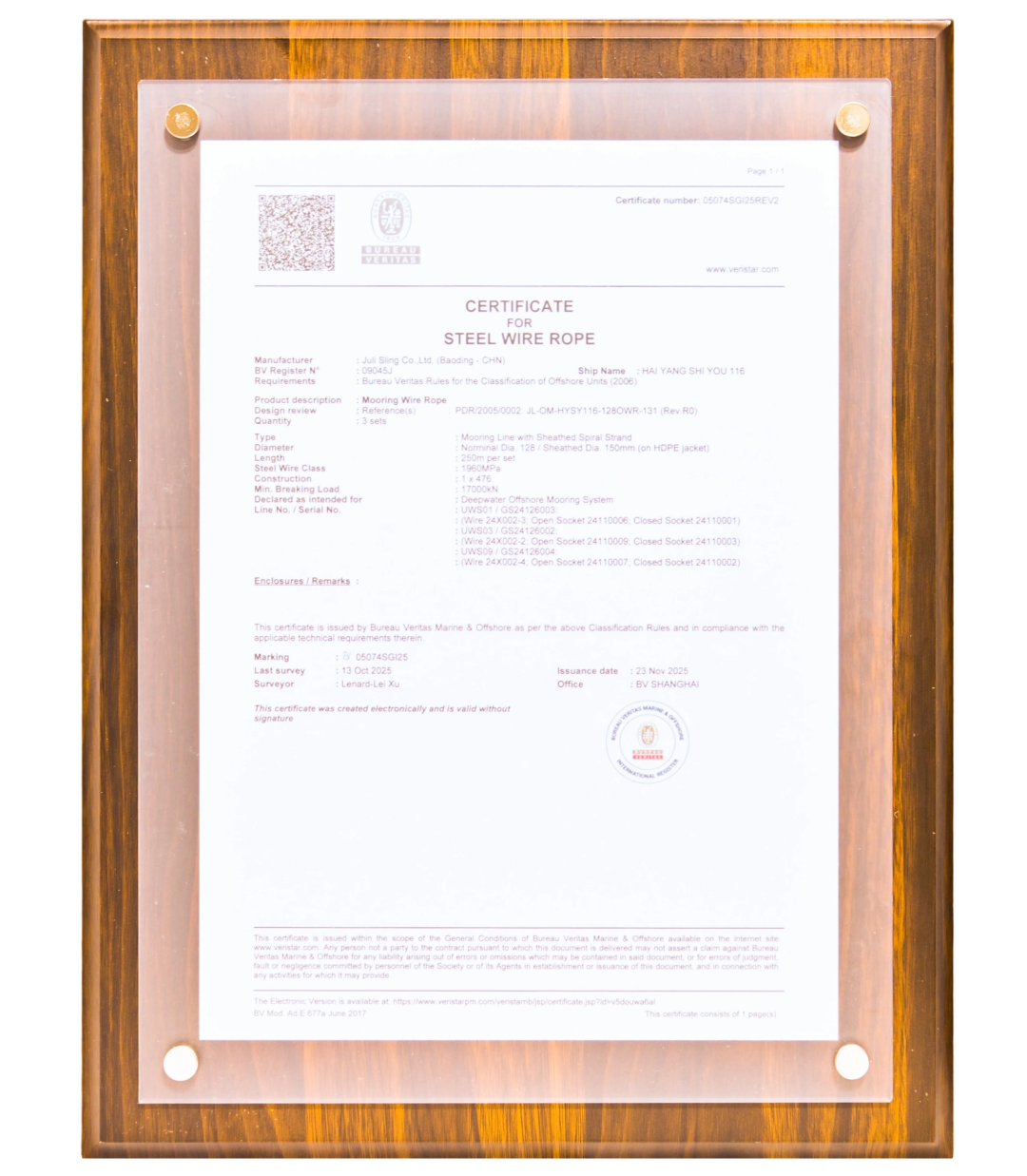 巨力索具常務(wù)副總裁李彥英表示:“這項(xiàng)認(rèn)證是針對(duì)海洋石油平臺(tái)長(zhǎng)期系泊索這一技術(shù)門檻領(lǐng)域的專項(xiàng)認(rèn)證,是對(duì)我們深耕深海裝備技術(shù)的最佳注腳。海洋石油平臺(tái)長(zhǎng)期系泊索不僅要滿足高強(qiáng)度要求,更要在抗疲勞、耐腐蝕和長(zhǎng)期可靠性方面表現(xiàn)卓越。BV的認(rèn)可,證明我們的產(chǎn)品完全符合國(guó)際最高安全標(biāo)準(zhǔn)。”